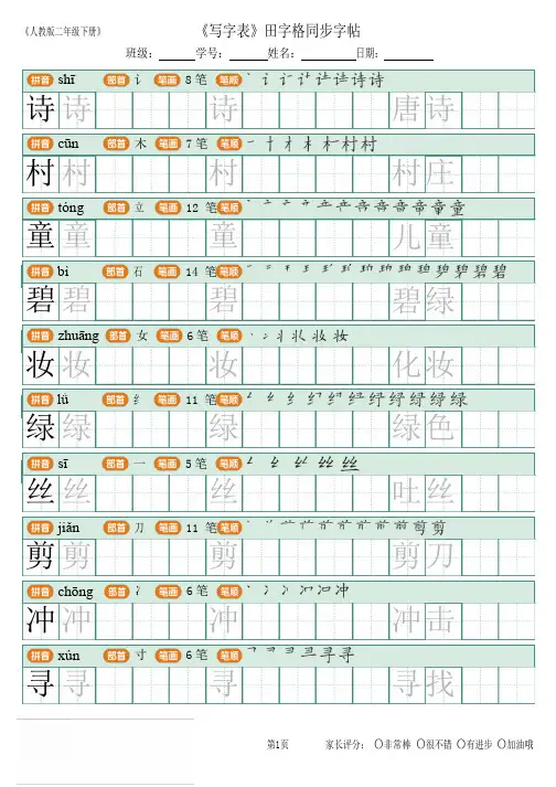 第 1 页家长评分:〇非常棒〇很不错〇有进步〇加油哦人教版二年级下册》生字表写字表田字格字帖》姓日班学人教版二年级下册》生字表写字表田字格字帖》人教版二年级下册》 生字表班级: 学号: 姓名:写字表田字格字帖》日期:s ǐ歹 6 笔死 死死生j ì 讠 5 笔记 记记记 忆p ì尸7 笔屁 屁屁屁 股g ǔ月 8 笔股 股股股 票j ìng冫 8 笔sh ǐ尸 9 笔 sh ǐ亻 8 笔ni ào尸 7 笔尿尿尿净净干净屎屎x ìng干 8 笔幸幸幸运人教版二年级下册》生字表班级:学号:姓名:使使使劲劲劲使劲班级:学号:姓名:日期:gāi 讠8 笔该该该应该kè刂8 笔mìng 口8 笔命令hú氵12 笔刻刻刻刻苦命命命湖湖湖湖泊li ná艹10 笔莲莲莲莲藕人教版二年级下册》生字表《写字表田字格字帖》班级:学号:姓名:日期:人教版二年级下册》生字表《写字表田字格字帖》人教版二年级下册》 生字表 《写字表田字格字帖》班级: 学号: 姓名: 日期:y íng 辶 7 笔迎 迎迎欢 迎p ū扌 5 笔扑 扑扑扑 向姓名:日期:班级:学号: d ǎo寸 6 笔导 导导导游y ǒng水5 笔永 永永永远lu àn乙7 笔乱 乱乱平 乱chu ǎ ng门6 笔闯 闯闯闯 祸p èng石13 笔碰 碰碰触 碰t è牜10 笔特特特别人教版二年级下册》生字表《写字表田字格字帖》人教版二年级下册》生字表《写字表田字格字帖》班级:学号:姓名:日期:班级:学号:姓名:日期:j ī ng 目13 笔睛睛睛眼ji oà见9 笔觉觉午觉觉zhí亻10 笔值值值值日l èi米9 笔类类种ji ān 艮8 笔艰艰艰gōng 弓 3 笔弓弓弓yán 火8 笔炎炎炎炎热hài 宀10 笔害害害害怕c ǐ止 6 笔此此此从此姓名:日期:班级:学号:13 笔斤新新x。