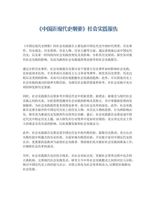《中国近现代史纲要》社会实践报告《中国近现代史纲要》的社会实践报告主要包括中国近代史中的时代背景、历史事件、历史观念、历史思想、历史人物、历史主题等方面,通过系统地记录中国近代历史,以及某一时间段内社会实践的变化及其影响,分析其历史原因,探究其对现代社会实践的影响,从而为新的社会实践提供理论指导的社会实践报告。