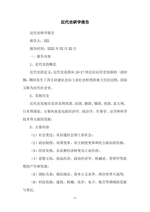 近代史调查报告格式篇一:近代史实践报告格式中国近现代史纲要社会实践报告课程名称:中国近现代史纲要实践题目:江西省xx 抗日战争中的损失专业班级:10给水排水工程专业(1)班姓名学号:xxx指导教师:刘飞华南昌工程学院思想政治理论课教学科研部(20XX—20XX学年第二学期)一:实践的目的和意义本次实践调研目的在于通过对抗战时期江西省各县市财政与人口损失的调查让我们能够了解抗日战争的基本史实,认清日本帝国主义发动侵华战争的罪行,把握历史发展规律。