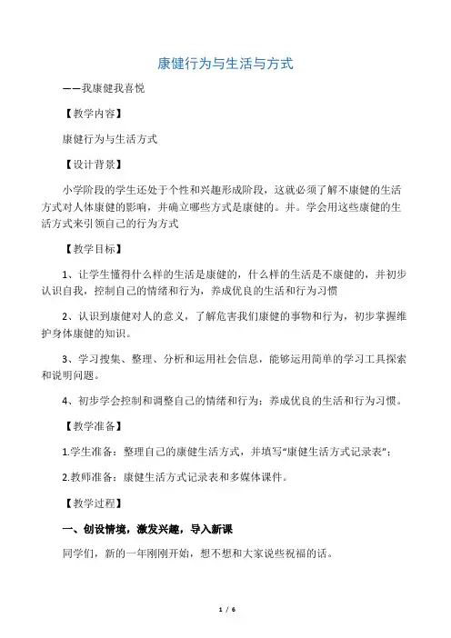 康健行为与生活与方式——我康健我喜悦【教学内容】康健行为与生活方式【设计背景】小学阶段的学生还处于个性和兴趣形成阶段,这就必须了解不康健的生活方式对人体康健的影响,并确立哪些方式是康健的。