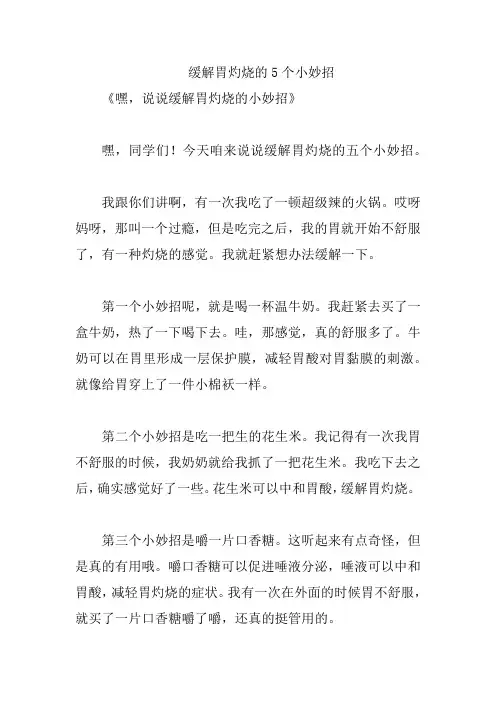 缓解胃灼烧的5个小妙招《嘿,说说缓解胃灼烧的小妙招》嘿,同学们!今天咱来说说缓解胃灼烧的五个小妙招。