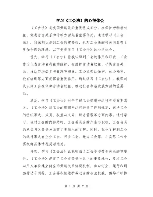 学习《工会法》的心得体会《工会法》是我国对工会组织和工会活动进行管理的法律,是我国工人阶级及其政治组织工会的组织法规,具有重要的法律地位和作用。