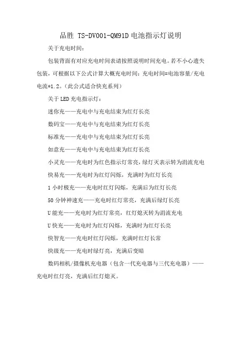 品胜 TS-DV001-QM91D电池指示灯说明关于充电时间: