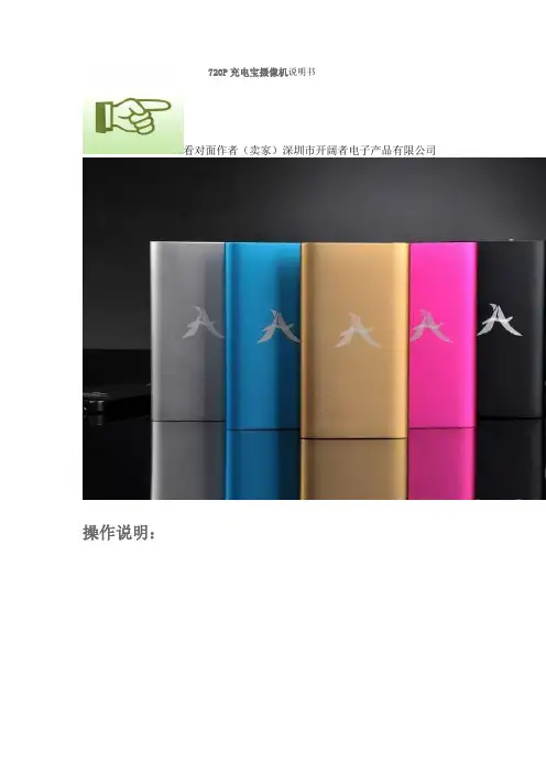 移动电源摄像机说明书The PowerCamconsists of two parts of functional unit: power bank unit and cameraunit. It can be used to charge the battery of DC-5V products, and also be used to recordhigh definition video and take photos. Power Bank Features Using high quality Li-ion battery cells, stable performance and long operation life.Multiple protection circuit, including overcharge, discharge protection, overload protection, etc.IR LED or LED torch function.Small and lightweight design, easy to carry, to meet emergency charging.Camera featuresSuper image sensor for low illumination video recording, quick light response.Full HD 1080P up to 30fps,720P up to 60fps.H.264 compression.Support up to 32GB micro SD card.RF remote control, easy operation.Integrated compact design, suitable formeeting recording, evidence recording, andoutdoor sports scenes, etc.Easy download to PC/MAC with USB plug.PowerCam LayoutPower Bank Operation1.Charging the PowerCamUse the micro USB cable to charge the PowerCam.The battery can be charged by following ways:(1). Charging from your computer’s USB.(2). Charging fromadapter’s USB.Ifthe red lightturns on, that means the PowerCam is in charge.Please wait for the red light turns off, which means the PowerCamis full of power. NOTE: When connecting with computer or adapter, it is recommended that the PowerCam is switchedoff.2.To Charge Other DevicesThe PowerCam fit for charging digital devices with DC-5V:(1).Connect your device to the USB outletof PowerCam.(2).Turn on the power of PowerCam to startcharging the device.When PowerCam’s battery close to low limit, the red indicator will light.3.Turning IR or LED Torch On/Off NOTE:This product has two configuration types: IR LED type and white-light LED type.(1).Turn on the power of PowerCam.(2).Keep push the remote control button○A 2 seconds to turn DV unit on.(3).Keep push the remote control button○C2 seconds will turn IR LED or LED torch on;and keep push the button○C2 seconds again, the IR LED or LED torch will be turned off.DVRecorder Operation1.Turning DVUnit On/OffSwitchon the power of PowerCam, Keep push the remote control button○A2 seconds will turn DV unit on. The blue indicatorwill light.Keep push the button○A 2 seconds again, theDV unit will be turned off.2.RecordingVideoTurn on the DV unit as in step 1. Keep push the remote control button○B2 seconds will start video recording, the green indicatorwill flash several times and then turn off.Keep push the button○B2 seconds again, the DV unit will stop recording, the blue indicatorwill lightand the PowerCam is in standby mode. The video streaming is divided into one file every 10 minutes.NOTE:(1). When the battery power is low, the bluelight will flash for seconds, and then the PowerCam will shut downautomatically. (2). When the memory is full, both the blue and green light will flash for seconds, and then the PowerCam will shut downautomatically.4.TakingPhotoBe sure the DV unit is turned on, short press the remote control button○B once to take a picture, the blue indicatorwill flash twice to indicatethat the picture was taken successfully.5.Setting the PowerCamConnect the PowerCamwith your computer USB port, a new removable disk will appear on the computer screen. Open the removable disk, you will find the file setup.exe under the root directory, double-click the file to run it, following window will appear:You can set date/time, frame size, videoimage quality, audiovolume, etc. After finishinglower left to save the settings. ClickdefaultSettings.Aftersafely removing the PowerCam from the computer and turn on the DV unit, the settings willtake effect.Specifications:Caution:ThePowerCam may become fairly hot during recording – this is normal. To ensure proper cooling do not block the flow of air to thecover of the PowerCam.No crash, do not open orknock thePowerCam. Do not expose them to fire, high temperatures, or water.We suggest charge with the qualifiedadaptor, if you find there is bulge or otherfaulty phenomena on PowerCam or charged device, pleasestop using it.Important:All jurisdictions have specific laws and regulations relating to the use of cameras and voice recorders. Before using any camera and/or voice recorder for any purpose it is the buyer′s responsibility to be aware of all applicable laws and regulations that prohibit or limit the use of cameras and voicerecorders, and to comply with the applicable laws and regulations.PowerCam是一款移动电源和摄像机合二为一的产品。