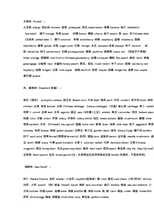 英语中常碰到的词汇水果类西红柿tomato 菠萝pineapple 西瓜watermelon 香蕉banana 柚子shaddock (pomelo)橙子orange 苹果apple 柠檬lemon 樱桃cherry 桃子peach 梨pear 枣Chinese date (去核枣pitted date )椰子coconut 草莓strawberry 树莓raspberry 蓝莓blueberry 黑莓blackberry 葡萄grape 甘蔗sugar cane 芒果mango 木瓜pawpaw或者papaya 杏子apricot 油桃nectarine 柿子persimmon 石榴pomegranate 榴莲jackfruit 槟榔果areca nut (西班牙产苦橙)bitter orange 猕猴桃kiwi fruit or Chinese gooseberry 金橘cumquat 蟠桃flat peach 荔枝litchi 青梅greengage 山楂果haw 水蜜桃honey peach 香瓜,甜瓜musk melon 李子plum 杨梅waxberry red bayberry 桂圆longan 沙果crab apple 杨桃starfruit 枇杷loquat 柑橘tangerine 莲雾wax-apple 番石榴guava肉、蔬菜类(livestock家畜):南瓜(倭瓜)pumpkin cushaw 甜玉米Sweet corn 牛肉beef 猪肉pork 羊肉mutton 羔羊肉lamb 鸡肉chicken 生菜莴苣lettuce 白菜Chinese cabbage (celery cabbage)(甘蓝)卷心菜cabbage 萝卜radish 胡萝卜carrot 韭菜leek 木耳agarics 豌豆pea 马铃薯(土豆)potato 黄瓜cucumber 苦瓜balsam pear 秋葵okra 洋葱onion 芹菜celery 芹菜杆celery sticks 地瓜sweet potato 蘑菇mushroom 橄榄olive 菠菜spinach 冬瓜(Chinese)wax gourd 莲藕lotus root 紫菜laver 油菜cole rape 茄子eggplant 香菜caraway 枇杷loquat 青椒green pepper 四季豆青刀豆garden bean银耳silvery fungi 腱子肉tendon 肘子pork joint 茴香fennel(茴香油fennel oil 药用)鲤鱼carp 咸猪肉bacon 金针蘑needle mushroom 扁豆lentil 槟榔areca 牛蒡great burdock 水萝卜summer radish 竹笋bamboo shoot 艾蒿Chinese mugwort 绿豆mung bean 毛豆green soy bean 瘦肉lean meat 肥肉speck 黄花菜day lily (day lily bud)豆芽菜bean sprout 丝瓜towel gourd (注:在美国丝瓜或用来做丝瓜茎loofah洗澡的,不是食用的)海鲜类(sea food):虾仁Peeled Prawns 龙虾lobster 小龙虾crayfish(退缩者)蟹crab 蟹足crab claws 小虾(虾米)shrimp 对虾、大虾prawn (烤)鱿鱼(toast)squid 海参sea cucumber 扇贝scallop 鲍鱼sea-ear abalone 小贝肉cockles 牡蛎oyster 鱼鳞scale 海蜇jellyfish 鳖海龟turtle 蚬蛤clam 鲅鱼culter 鲳鱼butterfish 虾籽shrimp egg 鲢鱼银鲤鱼chub silver carp 黄花鱼yellow croaker调料类(seasonings):醋vinegar 酱油soy 盐salt 加碘盐iodized salt 糖sugar 白糖refined sugar 酱soy sauce 沙拉salad 辣椒hot(red)pepper 胡椒(black)pepper 花椒wild pepper Chinese prickly ash powder 色拉油salad oil 调料fixing sauce seasoning 砂糖granulated sugar 红糖brown sugar 冰糖Rock Sugar 芝麻Sesame 芝麻酱Sesame paste 芝麻油Sesame oil 咖喱粉curry 番茄酱(汁)ketchup redeye 辣根horseradish 葱shallot (Spring onions)姜ginger 蒜garlic 料酒cooking wine 蚝油oyster sauce 枸杞(枇杷,欧查果)medlar 八角aniseed 酵母粉yeast barm Yellow pepper 黄椒肉桂cinnamon (在美国十分受欢迎,很多事物都有肉桂料) 黄油butter 香草精vanillaextract(甜点必备) 面粉flour 洋葱onion主食类(staple food):三文治sandwich 米饭rice 粥congee (rice soup)汤soup 饺子dumpling 面条noodle 比萨饼pizza 方便面instant noodle 香肠sausage 面包bread 黄油(白塔油)butter 茶叶蛋Tea eggs 油菜rape 饼干cookies 咸菜(泡菜)pickle 馒头steamed bread 饼(蛋糕)cake 汉堡hamburger 火腿ham 奶酪cheese 馄饨皮wonton skin 高筋面粉Strong flour 小麦wheat 大麦barley 青稞highland barley 高粱broomcorn (kaoliang )春卷Spring rolls 芋头Taro 山药yam 鱼翅shark fin 黄花daylily 松花蛋皮蛋preserved eggs 春卷spring roll 肉馅饼minced pie 糙米Brown rice 玉米corn 馅儿stuffing 开胃菜appetizer 面粉flour 燕麦oat 白薯甘薯sweet potato牛排steak 里脊肉fillet 凉粉bean jelly 糯米江米sticky rice 燕窝bird's nest 粟Chinese corn 肉丸子meat balls 枳橙citrange 点心(中式)dim sum 淀粉starch 蛋挞egg tart(dry fruits)干果类:腰果Cashew nuts 花生peanut 无花果fig 榛子filbert hazel 栗子chestnut 核桃walnut 杏仁almond 果脯preserved fruit 芋头taro 葡萄干raisin cordial 开心果pistachion 巴西果brazil nut 菱角,荸荠water chestnut (和国内食用法不同,做坚果食用)酒水类(beverage):红酒red wine 白酒white wine 白兰地brandy 葡萄酒sherry 汽水(软饮料) soda (盐)汽水sparkling water 果汁juice 冰棒Ice-lolly 啤酒beer 酸奶yoghurt 伏特加酒vodka 鸡尾酒cocktail 豆奶soy milk 豆浆soybean milk 七喜7 UP 麒麟(日本啤酒kirin)凉开水cold boiled water 汉斯啤酒Hans beer 浓缩果汁concentrated juice 冰镇啤酒iced(chilled ) beer 札幌(日本啤酒)Sapporo 爱尔啤酒(美国)ale A级牛奶grand A milk 班图酒bantu beer 半干雪利dry sark 参水牛奶blue milk 日本粗茶bancha 生啤酒draft beer 白啤酒white beer <苏格兰>大麦酒barley-bree 咖啡伴侣coffee mate零食类(snack):mint 薄荷糖cracker饼干, biscuit饼干, 棒棒糖bonbon 茶tea (沏茶make the tea)话梅prune candied plum 锅巴rice crust 瓜子melon seed 冰棒(冰果)ice(frozen)sucker 冰淇凌ice cream 防腐剂preservative 圣代冰淇淋sundae 巧克力豆marble chocolate barley 布丁pudding与食品有关的词语(some words about food):炸fired 炝quick boiled 烩braise (烩牛舌braised ox tongue)烤roast 饱嗝burp 饱了饱的full stuffed 解渴quench thirst (形容食物变坏spoil spoilage)preservative 防腐剂expiration date 产品有效期(形容酒品好:a good strong brew 绝味酿)中式早點:烧饼Clay oven rolls 油条Fried bread stick 韭菜盒Fried leek dumplings 水饺Boiled dumplings 蒸饺Steamed dumplings 馒头Steamed buns割包Steamed sandwich 饭团Rice and vegetable roll蛋饼Egg cakes 皮蛋100-year egg 咸鸭蛋Salted duck egg 豆浆Soybean。