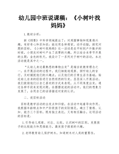 幼儿园中班说课稿:《小树叶找妈妈》1.教材分析:新《纲要》中科学领域提出了:对周围事物和现象感兴趣,有好奇心和求知欲:能运用各种感官,动手动脑,探究问题的目标。
