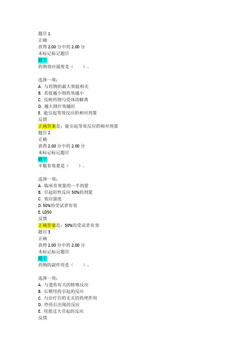 选择一项:A. 临床有效量的一半剂量B. 引起阳性反应50%的剂量C. 效应强度D. 50%的受试者有效E. LD50反馈正确答案是:50%的受试者有效题目3正确获得2.00分中的2.00分未标记标记题目题干药物的副作用是()。