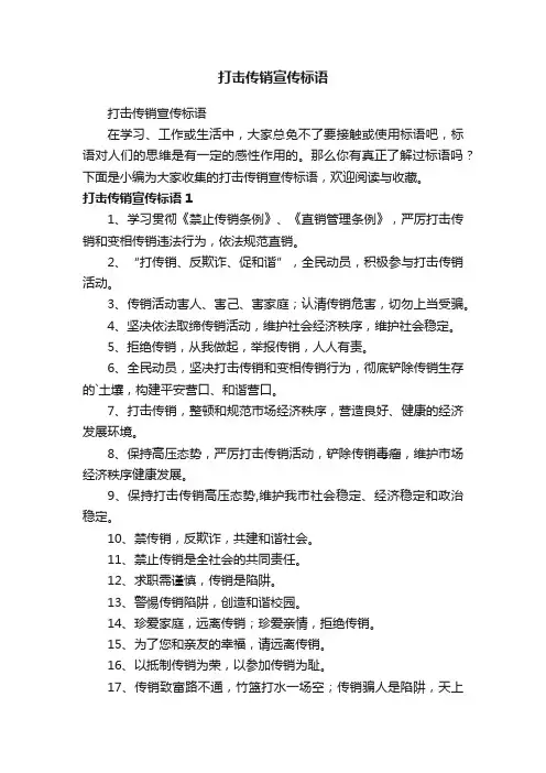 第二篇:打击传销宣传口号打击传销宣传口号禁止传销是全社会的共同责任传销违法,害人害己打击传销,人人有责求职需谨慎,传销是陷阱拒绝传销,从我做起,举报传销,人人有责传销致富路不通,竹篮打水一场空珍爱亲情,远离传销致富还需勤中求索,莫信传销暴富神话传销致富是陷阱,天上不会掉馅饼为了您和亲友的幸福,请远离传销传销发财是场梦,一旦陷入家财空全国禁止传销、规范直销工作宣传口号共有20条,分别为:禁止传销,规范直销;禁传销,反欺诈,共建和谐社会;禁止传销是全社会的共同责任;求职需谨慎,传销是陷阱;校园拒绝传销;以抵制传销为荣,以参加传销为耻;规范直销行为,维护市场秩序;打击传销,利国利民;全民动手,积极参与打击传销活动;拒绝传销,从我做起,举报传销,人人有责;传销致富路不通,竹篮打水一场空;传销是牢笼,入门人变虫;珍爱家庭,远离传销;珍爱亲情,远离传销;守法经营,抵制传销;指望传销致富,生活没有出路;致富还需勤中求索,莫信传销暴富神话;传销骗人是陷阱,天上不会掉馅饼;为了您和亲友的幸福,请远离传销;传销发财是场梦,一旦陷入家财空。