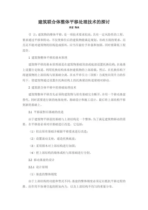 建筑联合体整体平移处理技术的探讨引言:建筑物的整体平移,是一项技术要求较高,具有一定风险性的工程,要求通过平移和转动,不仅使移位后的建筑物能满足规划、市政方面的要求,而且还不能对建筑物的结构造成损坏,应当尽量给予补强和加固,同时要降低工程造价。