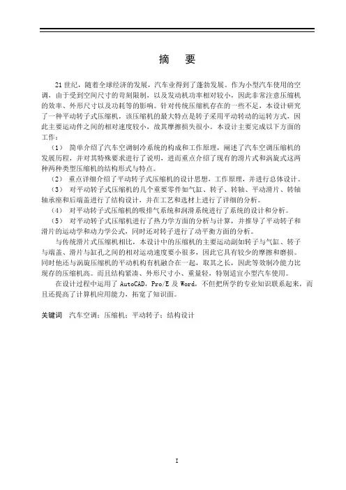 关键词汽车空调;压缩机;平动转子;结构设计AbstractThe 21st century, along with global economic development, the automobile industry gained vigorous development. Air conditioning which uses in the compact car, due to receive harsh limit from the spatial size, as well as the engine power is relatively small and therefore pays attention to influence from the efficiency of the compressor, the external dimensions as well as the power loss and so on. In view of traditional compressor exist some insufficiencies, this design has studied a fixed-rotor compressor, and the ultimate characteristic of this compressor is the rotor adopts a fixed-rotation mode of operation, the relative speed between the main movements is smaller, and therefore its friction loss is very small following the completion of the design of the main areas of work.(1)A brief introduction of the automotive air conditioning refrigeration system's constitution and the principle of work, elaborated the development process of automotive air conditioning compressor, and has carried on the explanation to its special request, then focus on introducing structure and characteristics of the existing gleitbretter type and the vortex type compressors.(2)Focus more on the introduction of a fixed-rotor compressor’s design concept, the principle of work, and overall design.(3)To the fixed-rotor compressor’s several important components like air cylinder, the rotor, the rotation shaft, the fixed-vane, the rotation shaft bearing seat and the back-end cover has carried out the structural design, and has carried on the detailed analysis in the craft and the selection.(4)we have carried systemic design and analysis on suction exhaust system and lubrication system of the fixed-rotor compressor.(5)We have carried on thermodynamic analysis and the calculation to the fixed-rotor compressor, and have inferred the fixed-rotor and vane's kinematic and dynamic formula, meanwhile have carried on the transient equilibrium analysis to the rotor.Compares with the traditional vane compressor, this design compressor has much smaller relative velocity between the main movements such as the rotor and the cylinder, the rotor and the end cover, the vane and the cylinder hole, therefore it has the few friction and the attrition. Simultaneously, it also integration of vortex compressor's translation machine together, takes its long, the equivalent cooling capacity higher than the existing compressor. Moreover the structure is compact, the external dimensions are small, the weight is light, and so it is especially for small vehicles.In the design process using AutoCAD, Pro / E and the Word, not only to learn the expertise, but also improve the ability of computer applications and broaden the knowledge.Key words Automobile air-conditioning compressor translation rotor structural design目录摘要 (I)Abstract ................................................................................................................I I 第1章绪论.. (1)1.1 汽车空调的历程、意义和特点 (1)1.1.1 汽车空调历程 (1)1.1.2 汽车空调的意义 (1)1.1.3 汽车空调的特点 (2)1.2 汽车空调制冷系统的构成及其原理 (2)1.3 汽车空调压缩机的发展历程 (3)1.4 汽车空调压缩机的特殊要求 (5)1.5 滑片压缩机的结构形式与特点 (5)1.6 涡旋压缩机的结构形式与特点 (6)1.7 本章小结 (7)第2章平动转子式压缩机 (7)2.1 设计方案的提出 (7)2.2 研究的意义 (8)2.3 平动转子式压缩机的工作原理 (8)2.4 平动转子式压缩机的基本结构 (10)2.5 平动转子式压缩机的总体特点 (10)2.6 平动转子式压缩机重要部件的设计 (11)2.6.1 缸体 (11)2.6.2 转子 (12)2.6.3 转轴 (13)2.6.4 平动滑片 (14)2.6.5 转轴轴承座和后端盖 (14)2.7 本章小结 (16)第3章平动转子式压缩机系统分析 (16)3.1 吸气与排气系统分析 (17)3.2 润滑系统分析 (18)3.3 本章小结 (18)第4章分析与计算 (18)4.1 热力学分析与计算 (18)4.1.1 热力学析 (18)4.1.2 热力计算 (23)4.2 运动分析与计算 (26)4.2.1 平动转子运动分析与计算 (26)4.2.2 滑片运动分析与计算 (27)4.3 动力学模型 (28)4.3.1 滑片受力分析 (28)4.3.2 转子受力分析 (30)4.4 转子的动平衡计算 (31)4.5 本章小结 (32)第 5 章制冷剂、润滑油及附件 (32)5.1 制冷剂 (32)5.1.1 选用制冷剂时应满足的基本条件 (32)5.1.2 改用R134a时采用的措施 (33)5.2 润滑油的选择 (34)5.2.1 选择润滑油需满足的要求........................................ 错误!未定义书签。
