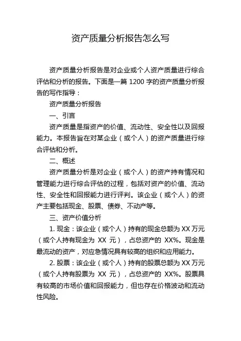 下面是一篇1200字的资产质量分析报告的写作指导:资产质量分析报告一、引言资产质量是指资产的价值、流动性、安全性以及回报能力。