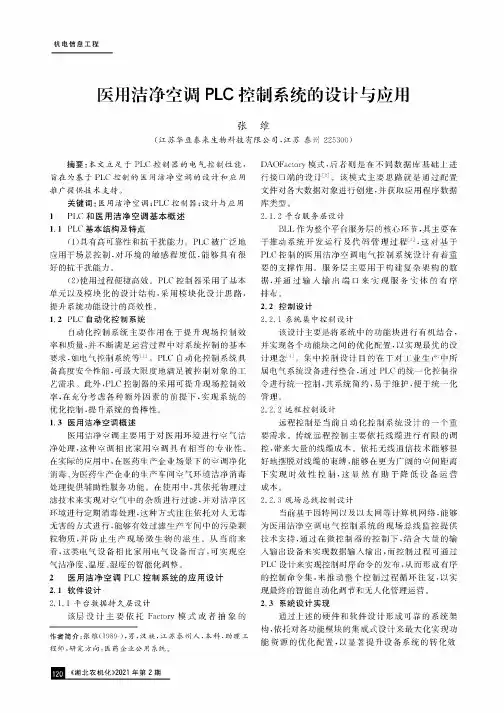 三、基于PLC的洁净手术室净化系统的自动控制设计基于PLC的洁净手术室净化系统的自动控制设计需要对送风系统、过滤系统和空调系统进行合理的控制策略设计,并将其编程实现自动调控。