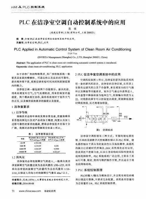 二、基于PLC的自动控制设计1. 空气处理系统的控制空气处理系统主要包括空气净化器、除湿器、空气冷却器等设备,通过PLC可以实现对这些设备的自动控制。