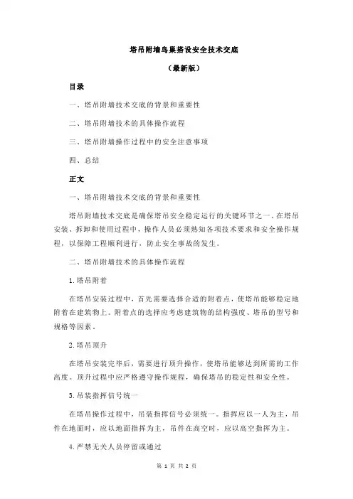 塔吊附墙鸟巢搭设安全技术交底(最新版)目录一、塔吊附墙技术交底的背景和重要性二、塔吊附墙技术的具体操作流程三、塔吊附墙操作过程中的安全注意事项四、总结正文一、塔吊附墙技术交底的背景和重要性塔吊附墙技术交底是确保塔吊安全稳定运行的关键环节之一。