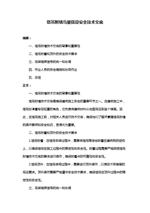 塔吊顶升加节及附着安全技术交底摘要本文档旨在对塔吊顶升加节及附着安全技术进行系统交底,为塔吊操作人员和相关施工人员提供安全操作指南。