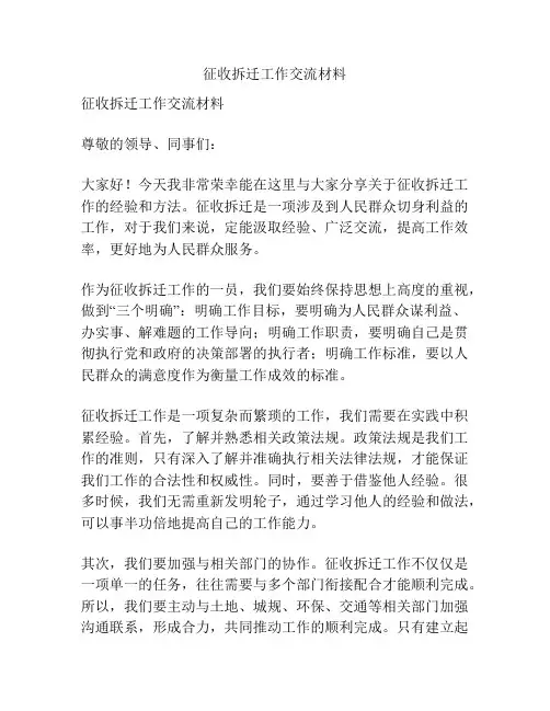 征地拆迁经验材料篇一:征地拆迁工作经验交流材料破解征迁瓶颈制约打造“XX速度”新典范X县XX镇人民政府征地拆迁工作,对于政府、入驻企业、施工单位和征地拆迁对象等有关各方都感到是一个大难题。