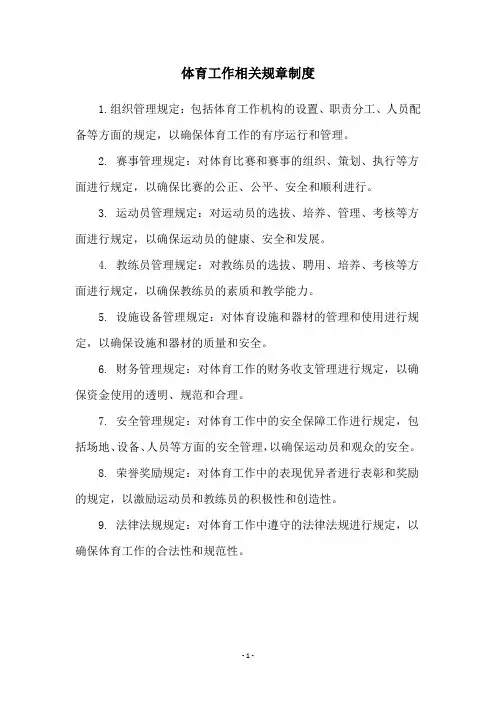 体育行业规章制度大全文档第一章总则第一条为了规范体育行业的管理秩序,促进体育事业的健康发展,保障运动员和群众的合法权益,特制定本规章制度。