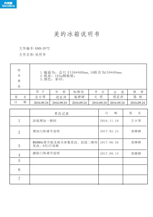 左小琴胡亚洲施婷婷陈 林胡亚洲2016.09.24技 术 要 求签 名日 期设 计 审 核标准化审 定会 签批 准合肥美的电冰箱有限公司美的冰箱说明书文件编号: SMS -2072文件名称: 说明书日 期签 名1更改记录232016.09.242016.09.242016.09.242016.09.24文 明2016.09.244567封底增加一维码2016.11.18左小琴增加门体调节说明2017.02.24郑婵婵8059标准升版及相关参数更改,封面二维码更改,8月1日切换2017.06.26郑婵婵删除门体调节说明2017.08.15郑婵婵封面封底折页示意图如下:BCD-646WGPZV快速使用说明| 4008899315冷藏室:门上托盘多功能储物盒果菜盒保鲜抽屉小储物盒保湿抽屉冷藏室抽屉盖板冷藏室玻璃搁架冷冻室中抽屉冷冻室上抽屉门托盘冷冻室下抽屉冷冻室:饺子盘如遇产品技术或软件升级,恕不另行通知;本产品只适合在中国大陆销售和使用;本公司保留说明书解释权;冰箱外观、颜色、图案以实物为准。