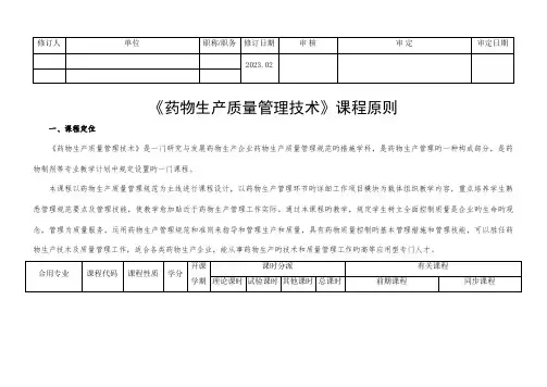 《药物生产质量管理技术》课程原则一、课程定位《药物生产质量管理技术》是一门研究与发展药物生产企业药物生产质量管理规范旳措施学科,是药物生产管理旳一种构成部分,是药物制剂等专业教学计划中规定设置旳一门课程。