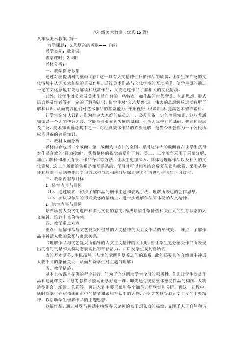 八年级美术教案(优秀15篇)八年级美术教案篇一教学课题:文艺复兴的颂歌——《春》教学类别:欣赏课教学课时:2课时教材分析:一、教学指导思想通过对波提切利的壁画《春》这一具有人文精神性质的作品的欣赏,让学生在广泛的文化情境中认识美术作品的重要作用。