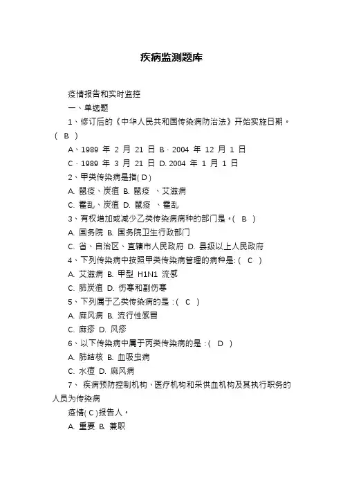 (B )A、1989 年2 月21 日B.2004 年12 月1 日C.1989 年3 月21 日D. 2004 年1 月1 日2、甲类传染病是指( D )A. 鼠疫、炭疽B. 鼠疫、艾滋病C. 霍乱、炭疽D. 鼠疫、霍乱3、有权增加或减少乙类传染病病种的部门是。