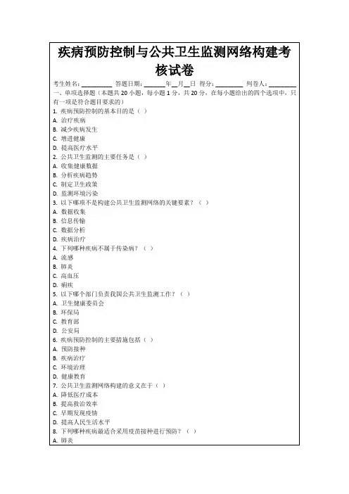 疾病控制专业试题及答案一、单项选择题(每题1分,共10分)1. 传染病的三个基本环节不包括以下哪项?A. 传染源B. 传播途径C. 易感人群D. 隔离措施答案:D2. 以下哪个不是疾病预防控制的基本原则?A. 预防为主B. 科学管理C. 个体治疗D. 群体控制答案:C3. 以下哪项不是疾病监测的目的?A. 早期发现病例B. 评估疾病控制措施的效果C. 确定疾病流行趋势D. 为患者提供治疗答案:D4. 疾病控制中,哪个阶段是最关键的预防阶段?A. 疾病发生前B. 疾病初期C. 疾病中期D. 疾病晚期答案:A5. 以下哪个不是疾病控制的策略?A. 健康教育B. 疫苗接种C. 隔离治疗D. 药物治疗答案:D6. 以下哪个是疾病控制中的“三早”原则?A. 早发现、早诊断、早治疗B. 早隔离、早诊断、早治疗C. 早发现、早隔离、早治疗D. 早诊断、早隔离、早治疗答案:A7. 疾病控制中,哪个措施是针对传染源的?A. 健康教育B. 隔离治疗C. 疫苗接种D. 环境消毒答案:B8. 以下哪个不是疾病控制中常用的健康教育方法?A. 宣传册B. 讲座C. 电视广告D. 药物治疗答案:D9. 疾病控制中,哪个环节是针对传播途径的?A. 个人卫生B. 环境卫生C. 社区隔离D. 药物治疗答案:B10. 以下哪个是疾病控制的最终目标?A. 降低发病率B. 减少死亡率C. 提高治愈率D. 以上都是答案:D二、多项选择题(每题2分,共10分)11. 以下哪些措施属于疾病预防控制的措施?A. 健康教育B. 疫苗接种C. 环境卫生管理D. 隔离治疗答案:ABCD12. 疾病控制中,以下哪些因素会影响疾病的传播?A. 气候条件B. 人群密度C. 个人卫生习惯D. 医疗资源答案:ABCD13. 疾病控制中,以下哪些是疾病监测的内容?A. 病例报告B. 疫情分析C. 风险评估D. 健康教育答案:ABC14. 以下哪些是疾病控制中常用的健康教育方法?A. 宣传册B. 讲座C. 电视广告D. 社交媒体答案:ABCD15. 疾病控制中,以下哪些措施可以减少疾病的发生?A. 疫苗接种B. 环境卫生管理C. 个人卫生习惯D. 隔离治疗答案:ABCD三、简答题(每题5分,共20分)16. 简述疾病控制的基本原则。