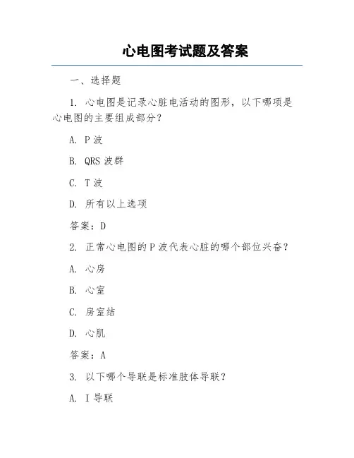 心电图考试题及答案一、选择题1. 心电图是记录心脏电活动的图形,以下哪项是心电图的主要组成部分?A. P波B. QRS波群C. T波D. 所有以上选项答案:D2. 正常心电图的P波代表心脏的哪个部位兴奋?A. 心房B. 心室C. 房室结D. 心肌答案:A3. 以下哪个导联是标准肢体导联?A. I导联B. II导联C. III导联D. aVR导联答案:A4. 心电图上ST段抬高常见于以下哪种疾病?A. 心肌梗死B. 心肌炎C. 心律失常D. 心力衰竭答案:A5. 以下哪种心律失常的心电图表现为P波消失,QRS波群不规则?A. 室性早搏B. 房性早搏C. 室性心动过速D. 心房颤动答案:D二、填空题1. 心电图上P波代表______的兴奋,QRS波群代表______的兴奋,T波代表______的兴奋。