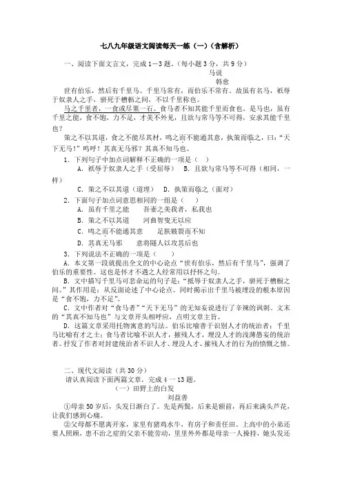 (二)比较阅读9、b11、d10、①鞭策它,不按准确的方法;喂养它,不能使它充分发挥自己的才能。