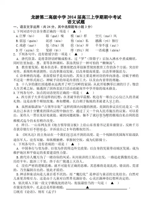 东阳中学2015年上学期期中考试卷高二语文一、语言文字运用(共31分,其中选择每题3分)1.下列各组加点的字,注音全对的一项是A.踯躅.(chú)箭镞.(zǔ)月杪.(miǎo)廖廓.(kè)B.舐.犊(shì)蹒跚.(shān)颠踬.(zhì)虬.曲(qiú)C.脚踝.(ké)黑黪黪.(càn)斜睨.(nì)宿.愿(sù)D.驯.服(shùn)惬.意(qiè)赝.品(yàn)模.范(mú)2.下列各组加点的字,注音全对的一项是A.撇.(piē)嘴纤.(xiān)维褶.(zhě)皱浑身解.数(xiè)B.毗.(pí)邻着.(zháo)落皱襞.(bì) 虚与委蛇.(shé)C.怂.(sǒng)恿晕眩.(xuàn) 城垛.(duǒ) 怙恶不悛.(quān)D.佝偻.(lóu) 渲.(xuàn)染字帖.(tiē)纡.(xū)尊降贵3.下列各句中,没有错别字的一项是A.半幽闭的参天的树木纹丝不动地挺立着,使你觉得自己仿佛置身于一座美仑美奂的禁宫之中。