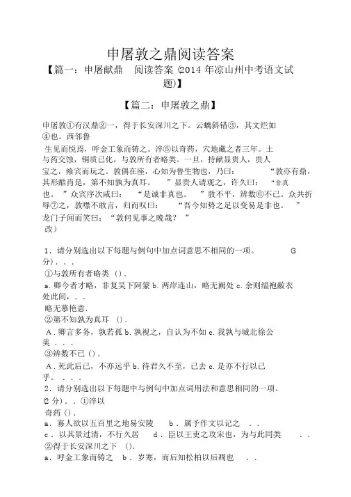 申屠敦之鼎阅读答案【篇一:申屠献鼎阅读答案 (2014 年凉山州中考语文试题)】【篇二:申屠敦之鼎】申屠敦①有汉鼎②一,得于长安深川之下。