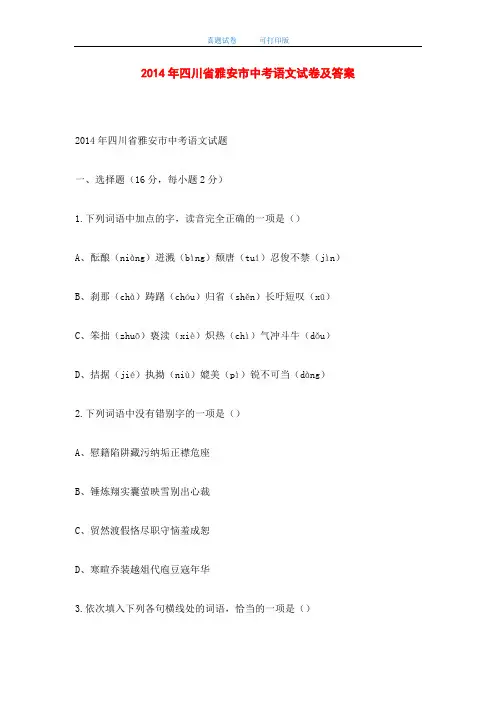 2014年四川省雅安市中考语文试卷及答案2014年四川省雅安市中考语文试题一、选择题(16分,每小题2分)1.下列词语中加点的字,读音完全正确的一项是()A、酝酿(niàng)迸溅(bìng)颓唐(tuí)忍俊不禁(jìn)B、刹那(chà)踌躇(chóu)归省(shěn)长吁短叹(xū)C、笨拙(zhuō)亵渎(xiè)炽热(chì)气冲斗牛(dǒu)D、拮据(jié)执拗(niù)媲美(pì)锐不可当(dàng)2.下列词语中没有错别字的一项是()A、慰籍陷阱藏污纳垢正襟危座B、锤炼翔实囊萤映雪别出心裁C、贸然渡假恪尽职守恼羞成恕D、寒暄乔装越俎代庖豆寇年华3.依次填入下列各句横线处的词语,恰当的一项是()莲是一种深受人们喜爱的水生植物:它有__________可爱的茎叶,有娇嫩__________的花朵,有__________的清香;它的果实(莲子)和茎(藕)都是食物中的佳品。
