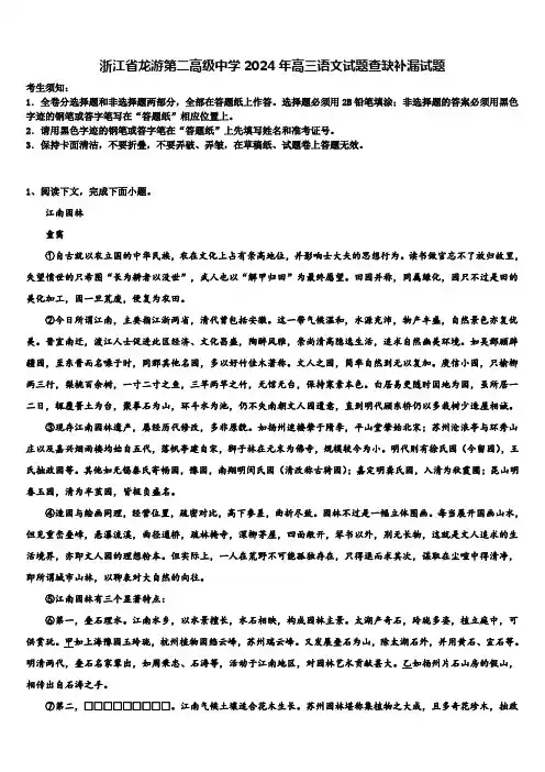 浙江省龙游第二高级中学2024年高三语文试题查缺补漏试题考生须知:1.全卷分选择题和非选择题两部分,全部在答题纸上作答。