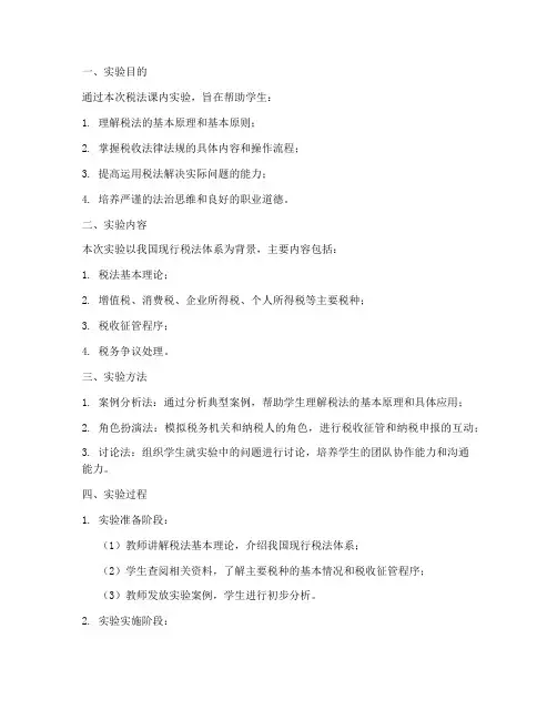 六、实验反思1. 实验过程中,部分学生对税法基本理论掌握不够扎实,需要进一步加强理论学习;2. 实验案例的选择和设计应更加贴近实际,以提高学生的实践能力;3. 实验过程中,教师应注重培养学生的创新思维和批判性思维。