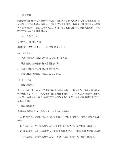 二、实习单位及时间实习单位:XX市税务局实习时间:2021年7月1日至2021年8月31日三、实习目的1. 了解我国税收法律法规的基本框架和主要内容;2. 掌握税收实务操作的基本流程和技巧;3. 提高自己的实际工作能力和职业素养;4. 培养团队协作精神,增强沟通协调能力。