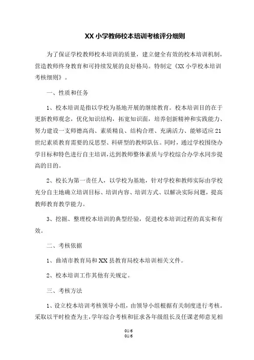 XX小学教师校本培训考核评分细则为了保证学校教师校本培训的质量,建立健全有效的校本培训机制,营造教师终身教育和可持续发展的良好格局。