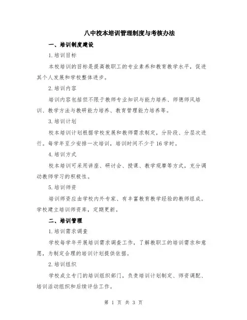 八中校本培训管理制度与考核办法一、培训制度建设1.培训目标本校培训的目标是提高教职工的专业素养和教育教学水平,促进其个人发展和学校整体进步。