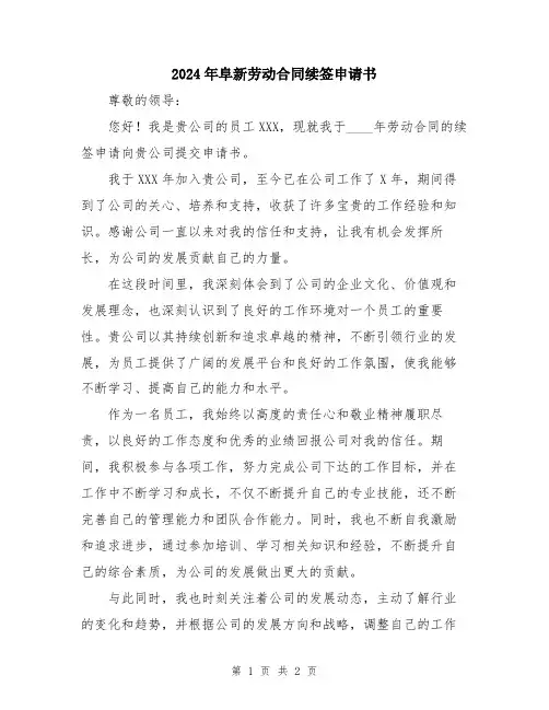 2024年阜新劳动合同续签申请书尊敬的领导:您好!我是贵公司的员工XXX,现就我于____年劳动合同的续签申请向贵公司提交申请书。