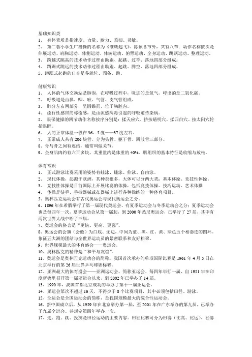 基础知识类1、身体素质是指速度、力量、耐力、柔韧、灵敏。