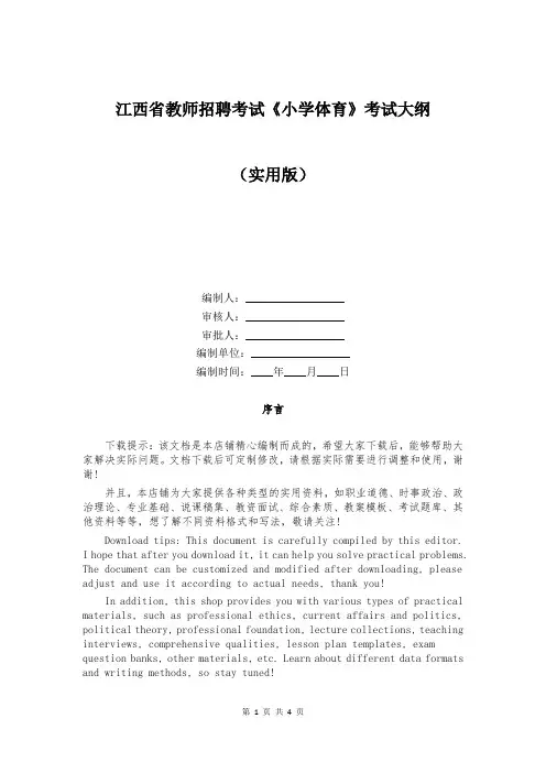江西省教师招聘考试《小学体育》考试大纲(实用版)编制人:__________________审核人:__________________审批人:__________________编制单位:__________________编制时间:____年____月____日序言下载提示:该文档是本店铺精心编制而成的,希望大家下载后,能够帮助大家解决实际问题。