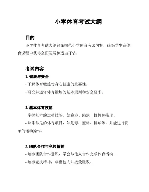 小学体育考试大纲旨在规范小学体育考试内容,确保学生在体育课程中获得全面发展和适当评估。