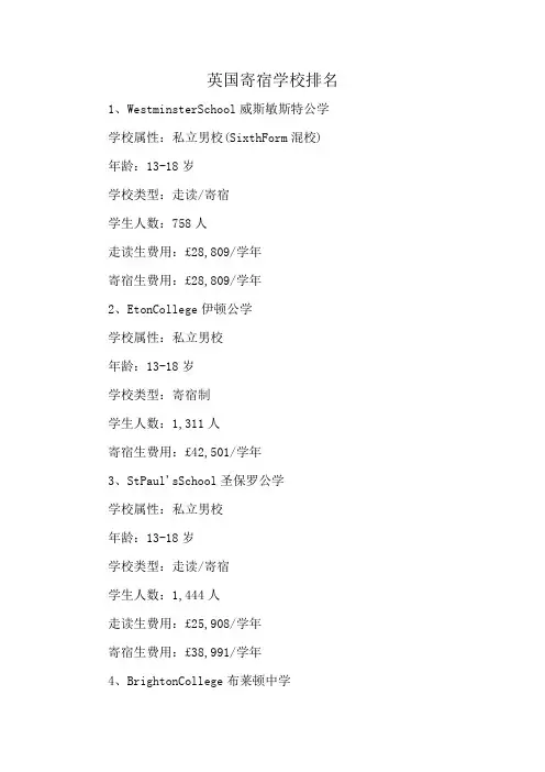 英国寄宿学校排名1、WestminsterSchool威斯敏斯特公学学校属性:私立男校(SixthForm混校) 年龄:13-18岁学校类型:走读/寄宿学生人数:758人走读生费用:£28,809/学年寄宿生费用:£28,809/学年2、EtonCollege伊顿公学学校属性:私立男校年龄:13-18岁学校类型:寄宿制学生人数:1,311人寄宿生费用:£42,501/学年3、StPaul'sSchool圣保罗公学学校属性:私立男校年龄:13-18岁学校类型:走读/寄宿学生人数:1,444人走读生费用:£25,908/学年寄宿生费用:£38,991/学年4、BrightonCollege布莱顿中学学校属性:私立混校年龄:3-18岁学校类型:寄宿/走读学生人数:1,088人走读生费用:£17,490/学年寄宿费用:£39,720/学年5、SevenoaksSchool七橡树中学建校时间:1432年学校类型:混校,寄宿学校地理位置:肯特郡sevenoaks小镇学生年龄:11-18岁6、DulwichCollege德威公学学校属性:私立男校年龄:2-18岁学校类型:走读/寄宿学生人数:1,811人走读生费用:£21,246/学年寄宿生费用:£44,346/学年7、WinchesterCollege温切斯特公学学校属性:私立男校年龄:13-18岁学校类型:寄宿学生人数:690人寄宿生费用:£41,709/学年8、WycombeAbbeySchool威雅公学学校属性:私立女校年龄:11-18岁学校类型:寄宿/走读学生人数:629人走读生费用:£30,270/学年寄宿费用:£40,350/学年9、TonbridgeSchool汤布里奇中学学校属性:私立男校年龄:13-18岁学校类型:走读/寄宿学生人数:789人走读生费用:£31,587/学年寄宿生费用:£42,105/学年10、CheltenhamLadies'College切尔滕纳姆女子学院学校属性:私立女校年龄:11-18岁学校类型:寄宿/走读学生人数:845人走读生费用:£25,740/学年寄宿费用:£38,340/学年。