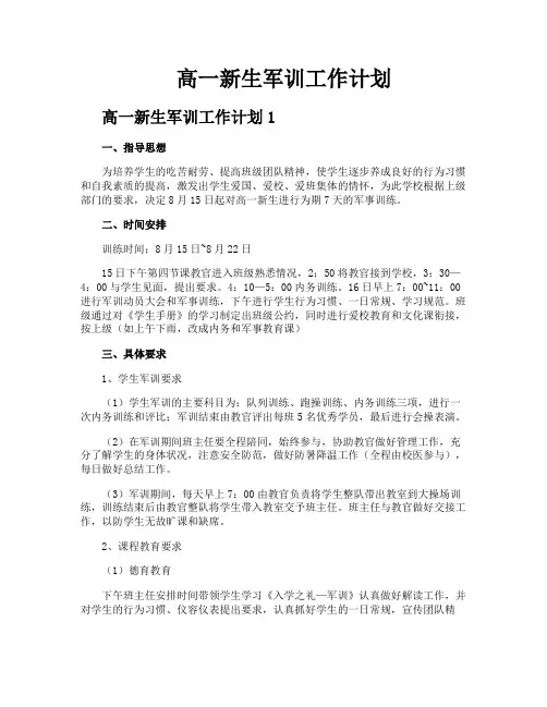 三、新生军训工作配合好学校的新生军训工作,并且在军训期间,主要工作如下:1.迅速了解班级,了解寝室的情况,遇到问题做到及时、迅速解决;2.观察班级的班风形成,及早发现班级内部一些意志力,组织观念不强的同学,并给予教育;3.培养并发现品行兼优的干部苗子;4.利用军训机会,进一步加强和班级同学的交流,让新生班级形成的班级凝聚力。
