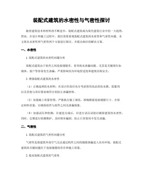 二、气密性1. 装配式建筑的气密性问题分析气密性是指建筑外部空气无法通过构件之间的缝隙泄漏进入室内环境。