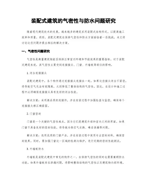 三、解决装配式建筑气密性问题的方法1. 引入先进材料:选择具有良好防水、防潮、抗温差变形等特性的材料进行施工,能有效降低气密性问题的发生。