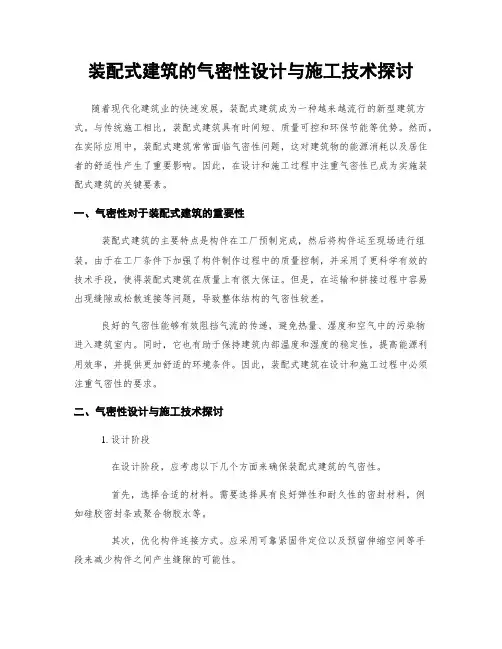 二、装配式建筑施工中的主要气密性技术1. 预制墙体结构设计和加固预制墙体是装配式建筑中常用的组件,其设计和加固对于提高整个建筑系统的气密性起着重要作用。