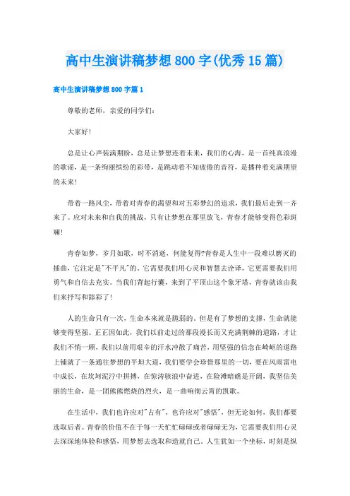 高中梦想800字演讲稿(优秀4篇)高中梦想800字演讲稿篇1尊敬的各位老师、亲爱的同学们:早上好!今天,我跟大家探讨的话题是《有梦想,更要有行动》。
