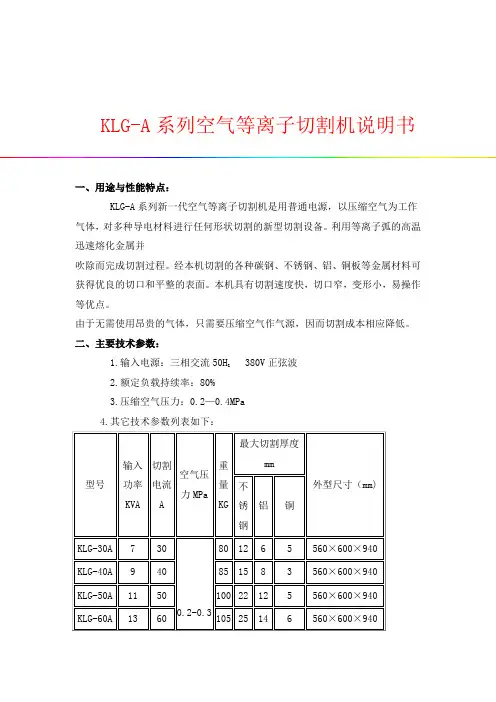 KLG-A 系列空气等离子切割机说明书一、用途与性能特点:KLG-A 系列新一代空气等离子切割机是用普通电源,以压缩空气为工作气体,对多种导电材料进行任何形状切割的新型切割设备。