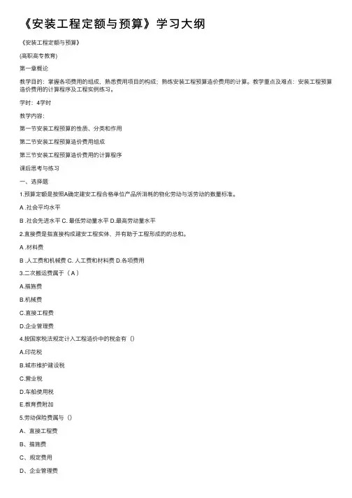 《安装⼯程定额与预算》学习⼤纲《安装⼯程定额与预算》(⾼职⾼专教育)第⼀章概论教学⽬的:掌握各项费⽤的组成,熟悉费⽤项⽬的构成;熟练安装⼯程预算造价费⽤的计算。