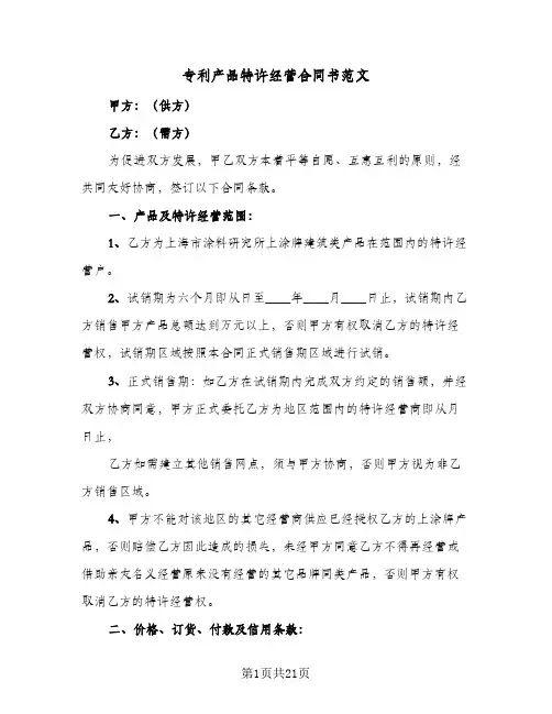 三、专利产品的供应及价格1. 甲方保证及时向乙方提供足够的专利产品,确保乙方的市场需求得到满足。