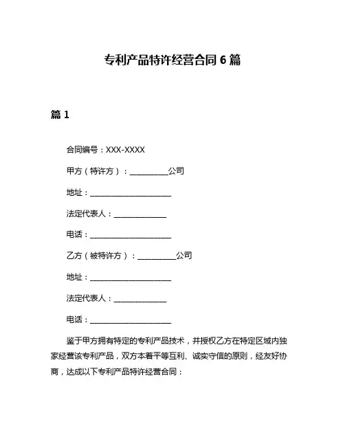 专利产品特许经营合同书样本6篇篇1甲方(特许方):____________________乙方(被特许方):____________________鉴于甲方拥有特定的专利产品技术,并授权乙方在特定区域内进行独家经营,双方本着自愿、平等、互利的原则,经友好协商,达成以下合同协议:一、合同目的本合同旨在明确甲乙双方关于专利产品特许经营的各项权利和义务,确立双方的市场经营秩序和利益共享机制。